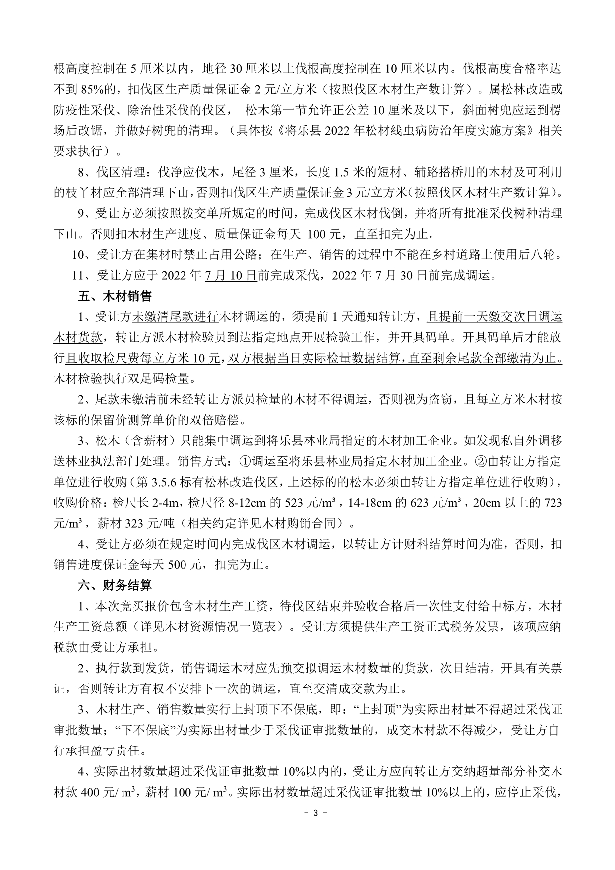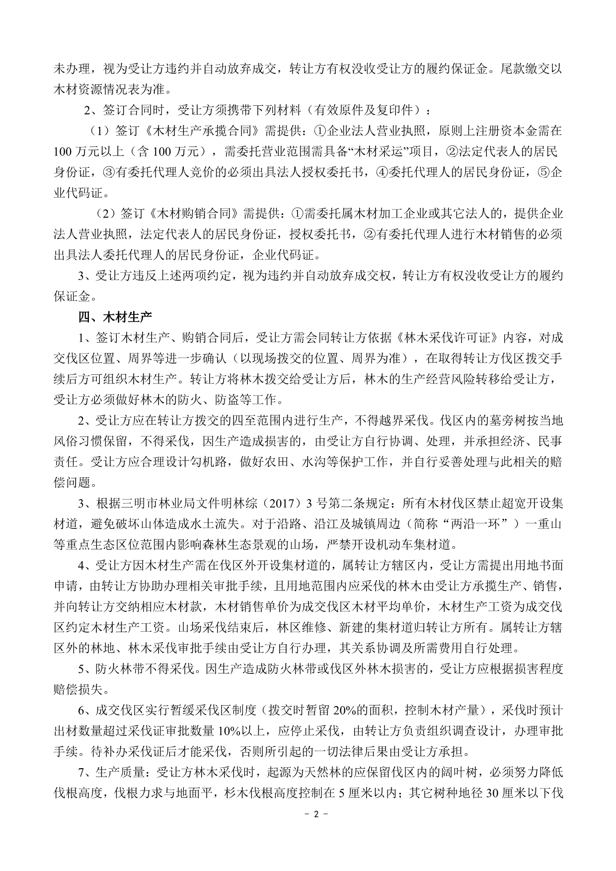 重要信息披露 | 1、標(biāo)的簡介所列的出材量等數(shù)據(jù)僅供參考,標(biāo)的以現(xiàn)狀交付,轉(zhuǎn)讓方及交易中心不承擔(dān)標(biāo)的面積與實(shí)測(cè)面積、標(biāo)的出材量與實(shí)際出材量差異等責(zé)任,不調(diào)整相應(yīng)的成交價(jià)格。 2、本次競買報(bào)價(jià)包含木材生產(chǎn)工資,木材生產(chǎn)工資總額詳見木材資源情況一覽表,待伐區(qū)結(jié)束并驗(yàn)收后一次性支付給受讓方。 3、銷售費(fèi)用、成交后發(fā)生的政策變化費(fèi)用、稅收均由受讓方承擔(dān)。 4、松木(含薪材)只能集中調(diào)運(yùn)到將樂縣林業(yè)局指定的木材加工企業(yè)。如發(fā)現(xiàn)私自外調(diào)的,將移送林業(yè)執(zhí)法部門處理。銷售方式:①調(diào)運(yùn)至將樂縣林業(yè)局指定木材加工企業(yè)。②由轉(zhuǎn)讓方指定單位進(jìn)行收購(第3.5.6標(biāo)中有松木改造伐區(qū),上述標(biāo)的的松木必須由轉(zhuǎn)讓方指定單位進(jìn)行收購)(相關(guān)約定詳見木材購銷合同)。 5、受讓方應(yīng)于2022年7月10日前完成采伐,2022年7月30日前完成調(diào)運(yùn)。 6、本次交易第1標(biāo)和第2標(biāo)木材運(yùn)輸需經(jīng)過木材建造的花橋,限載4m,同時(shí),第1標(biāo)伐區(qū)道路開設(shè)需經(jīng)過軍用光纜,道路開設(shè)時(shí)應(yīng)避開。第4標(biāo)寺許村伐區(qū)運(yùn)輸需經(jīng)過高速公路底下涵洞,限高限載6m3,吳厝地村伐區(qū)道路開設(shè)需經(jīng)過電站的水管。一旦參與交易表明意向受讓方已認(rèn)可并接受該風(fēng)險(xiǎn),由該風(fēng)險(xiǎn)產(chǎn)生的一切后果和費(fèi)用由意向受讓方承擔(dān)。 7、未盡事宜詳見木材資源情況一覽表、競買約定、木材生產(chǎn)承包合同(范本)、木材購銷合同(范本)、伐區(qū)位置示意圖等本公告其他附件。 | ||