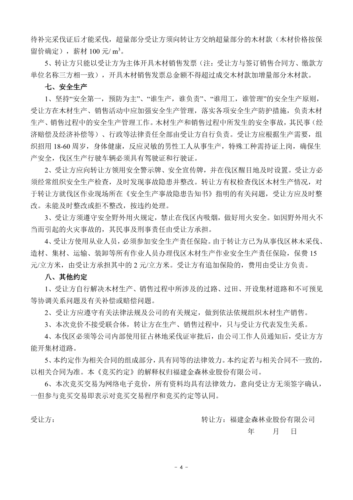 成交確認(rèn)、價(jià)款支付及合同簽訂 | 1 .成交后的兩個(gè)工作日內(nèi)受讓方以微信、郵箱等方式收到《成交通知書》掃描件或電話通知;若受讓方未及時(shí)收到成交通知書的,請(qǐng)主動(dòng)與轉(zhuǎn)讓方聯(lián)系。 2.價(jià)款交納日期及方式:成交后,受讓方須于2022年5月3日17:00前將首期木材款(詳見木材資源情況一覽表)及每標(biāo)生產(chǎn)風(fēng)險(xiǎn)保證金6.5萬元(含木材生產(chǎn)進(jìn)度、質(zhì)量保證金3萬元;銷售進(jìn)度保證金1.5萬元;安全生產(chǎn)保證金2萬元)轉(zhuǎn)入轉(zhuǎn)讓方指定銀行賬戶,并與轉(zhuǎn)讓方簽訂《木材生產(chǎn)承攬合同》和《木材購銷合同》。尾款交付方式以木材資源情況一覽表為準(zhǔn)。 轉(zhuǎn)讓方指定銀行賬戶如下: 戶名:福建金森林業(yè)股份有限公司 開戶銀行:福建將樂成功村鎮(zhèn)銀行股份有限公司 賬號(hào):9031510010010000033058 3.受讓方不依據(jù)本公告的要求履約的,視為自動(dòng)放棄受讓資格,其已交納的交易保證金不予退回,并對(duì)交易中心因此造成的損失承擔(dān)賠償責(zé)任,轉(zhuǎn)讓方有權(quán)將該標(biāo)的重新組織競買交易。 | ||