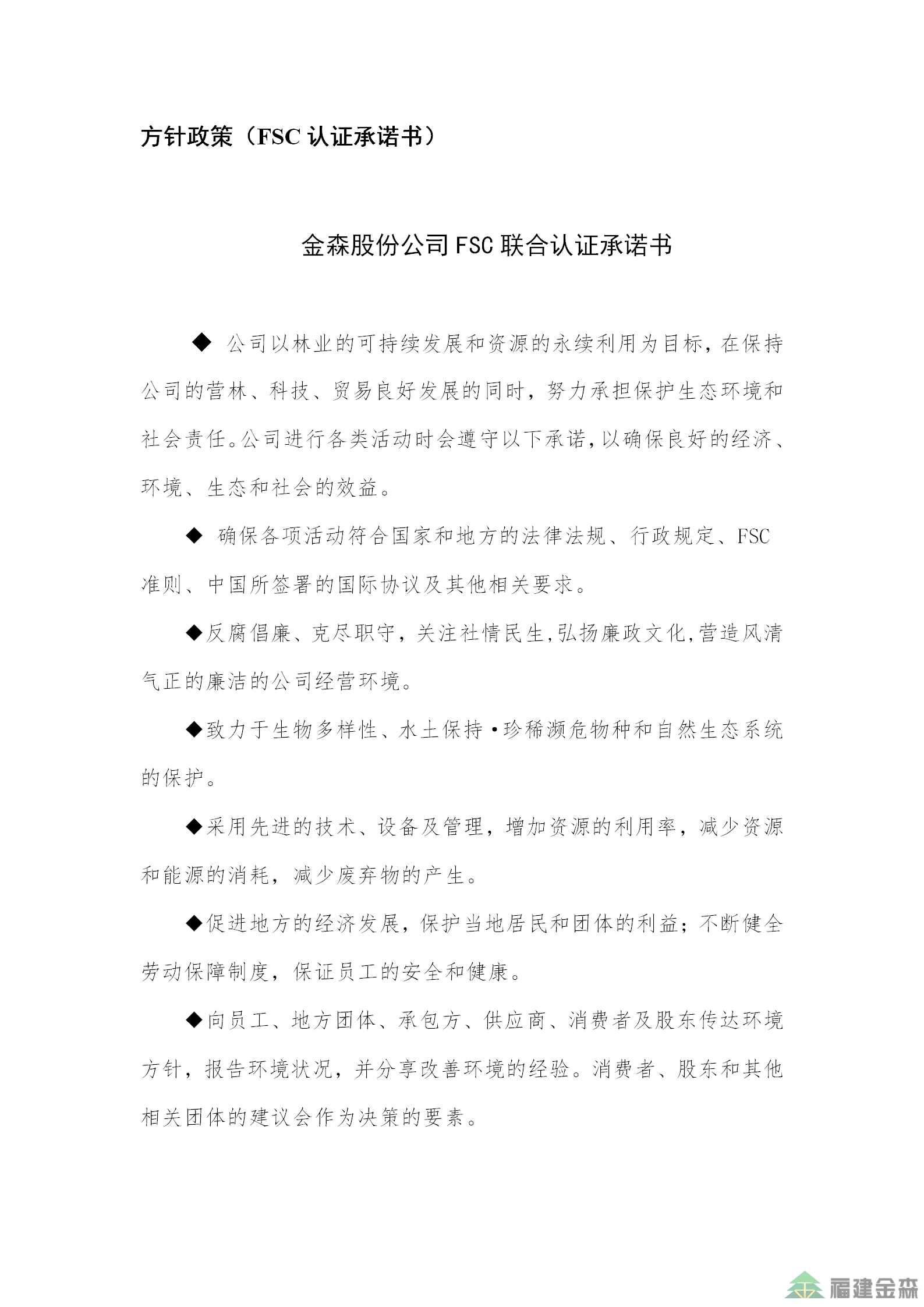 福建金森林業股份有限公司FSC聯合認證承諾書